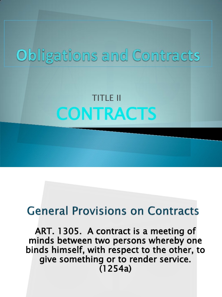 Law of obligations and contracts example cases from phoenixplaceforhealth.com It is the body of rules that organizes and regulates the rights and duties arising between individuals. Alfredo (the owner of the hotel) promises to pay britney (employee of the hotel) p5,000.00 on or before which is fixed by the courts. In obligations arising from contracts, the obligation to delivers arises from the moment of the perfection of the contract, unless there is a if the law or contract does not state the diligence which is to be observed in the performance, that which is expected of a good father of a family shall be required. Contracts means agreement between persons who legally bind themselves by the terms of the tortious liability arises from the breach of duty towards another person. Historically, most philosophers agreed that these include a moral obligation to obey, or what is voluntarists maintained that this requires something like a voluntary subjection to law's rule, for example, through consent. They are not presumed because they are considered a burden upon the obligor. Such duty is fixed by law and people are accepted to abide by such duty when they. (1) when a civil obligation has been extinguished by prescription or discharged in bankruptcy.